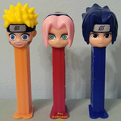 Naruto arrived from Europe and we have a few of these awesome Japanese manga characters in stock now. Naruto is the yellow haired main character, Sakura is the pink haired girl and Sasuke is the blue haired boy. We expect these to be the same as the assortment scheduled to be released in April in the USA, but we have a few of the European sets in stock now! We have orders placed for the USA Assortment and for the Naruto Pez Twin packs as well.